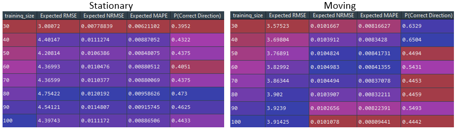 As expected, the accuracy of the stationary training set decreases as the projection length increases. The lowest RMSE is produced by a training set of size 30, but it also results in the worse accuracy for predicting directional change. The two-tailed t-tests reveal that there is no statistically significant difference between the 30- and 50-day training set, so sticking with the 50-day set actually results in better accuracy for predicting directional change; unfortunately, it’s still far below the short-term results.
